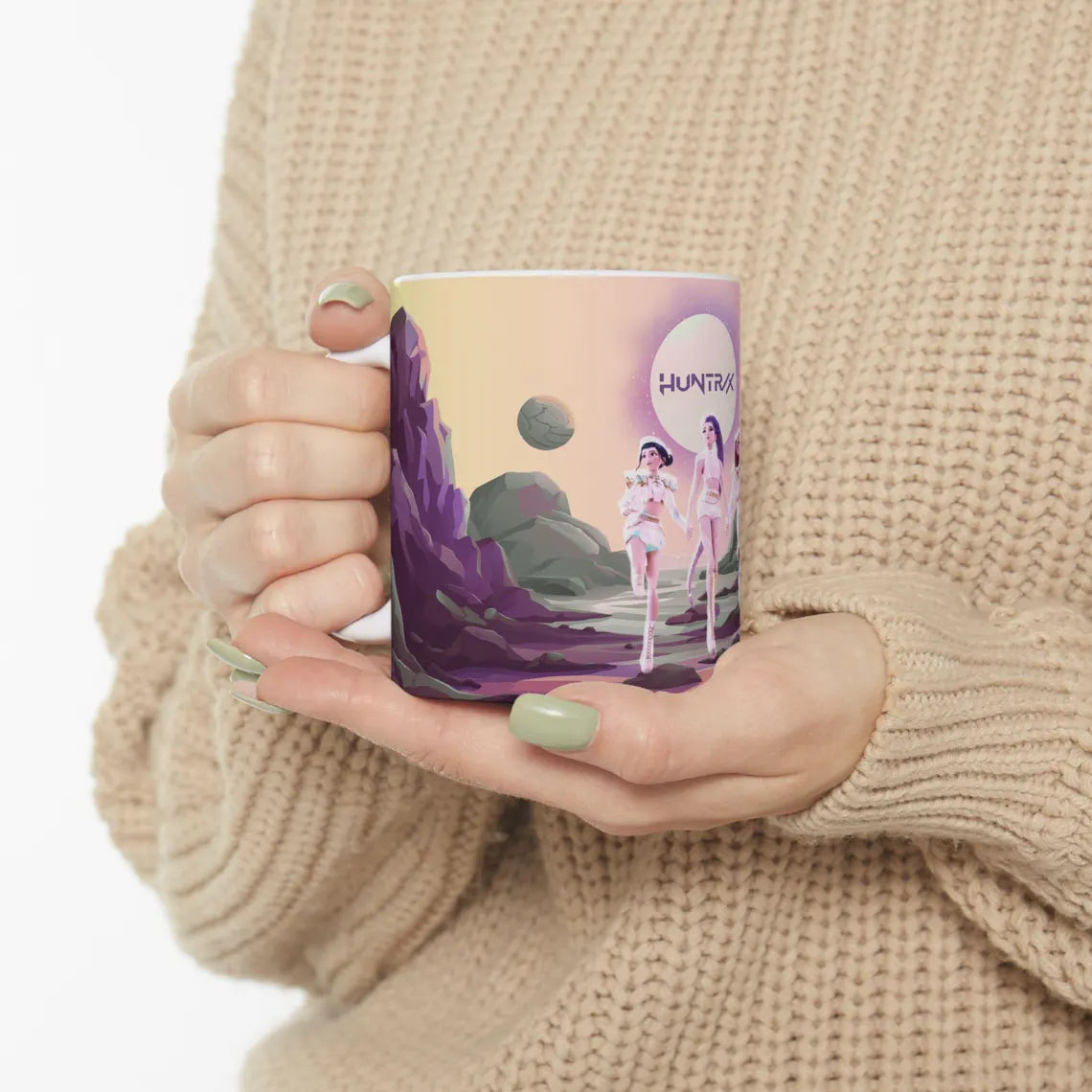Caneca de cerâmica vibrante Huntrix Trio Fantasy, perfeita para fãs de K.pop Hunters. Esta caneca de café artística é um presente exclusivo das Huntrix, ideal para uso em casa ou no escritório. As cores vibrantes e o acabamento brilhante tornam-na uma opção de destaque para bebidas.