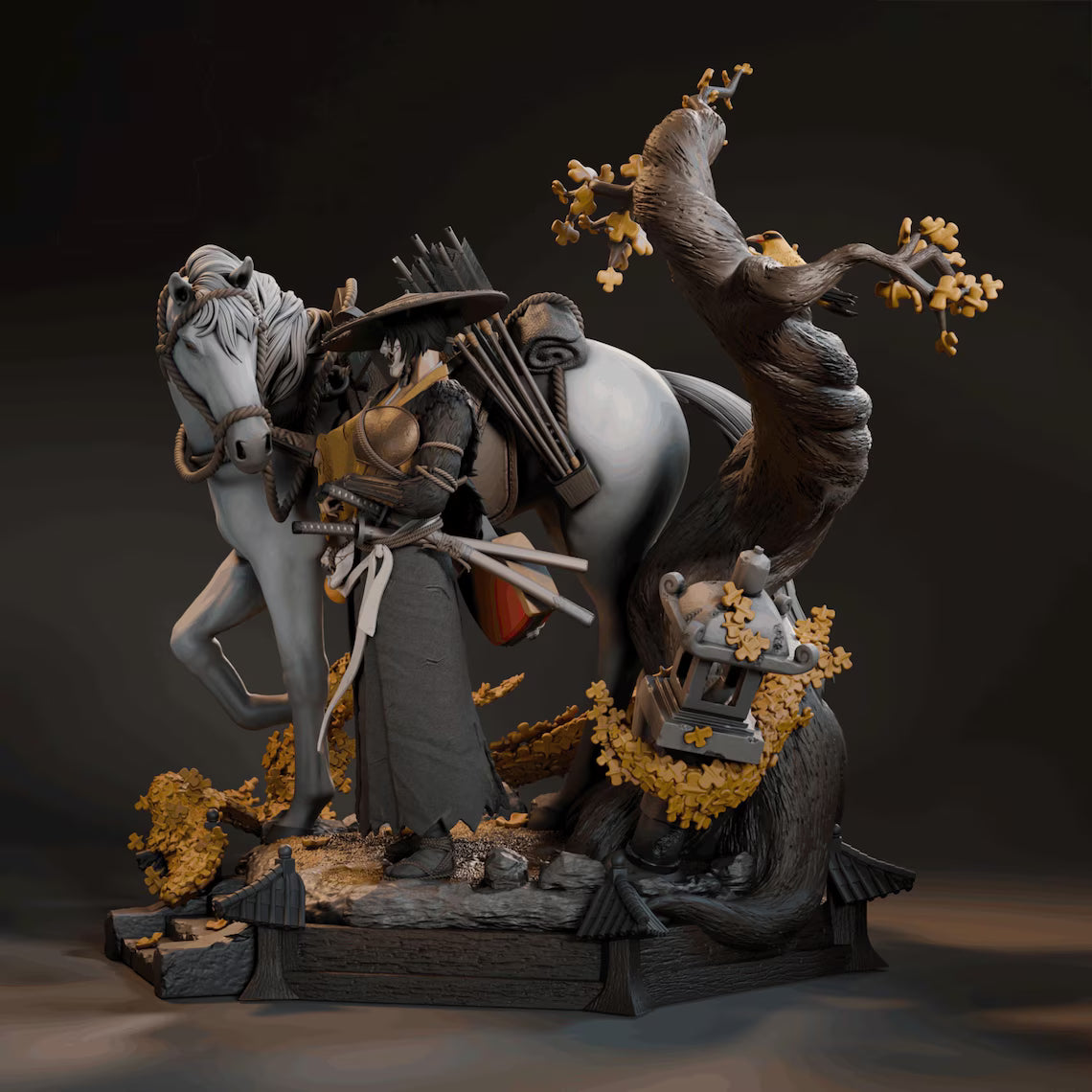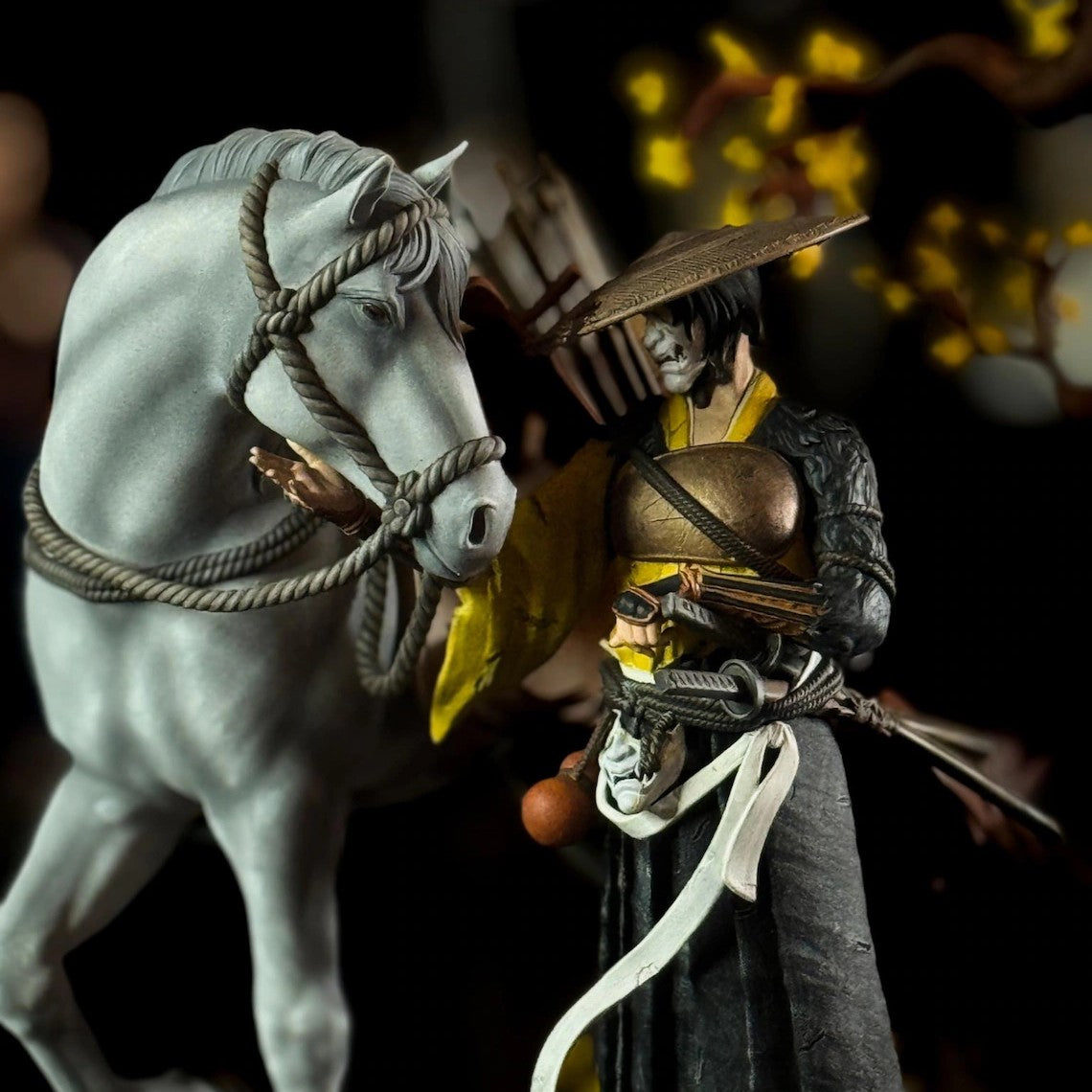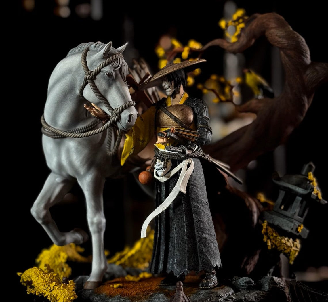 Mergulhe no mundo dos samurais com este diorama de colecionador de tirar o fôlego, inspirado em Ghost of Yotei e apresentando o icónico personagem Atsu. Esta peça deslumbrante captura a samurai solitária com o seu leal cavalo sob uma árvore outonal, personificando a beleza atmosférica do jogo.