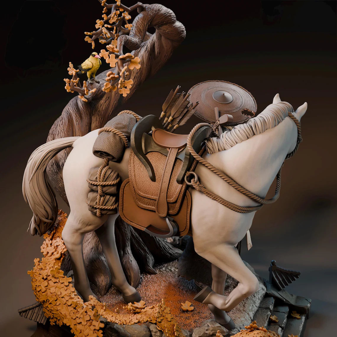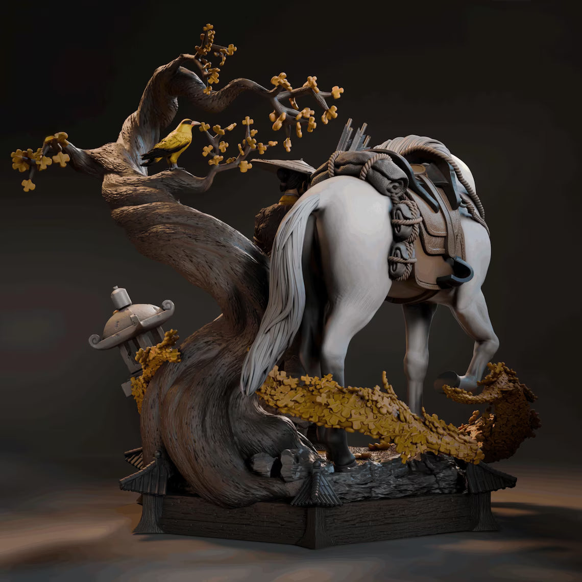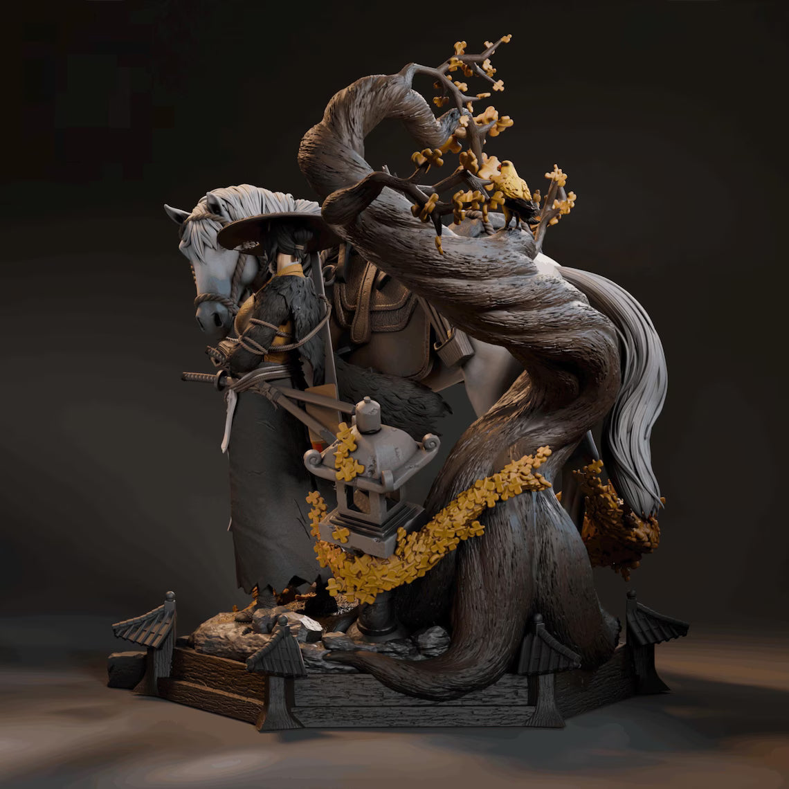 Mergulhe no mundo dos samurais com este diorama de colecionador de tirar o fôlego, inspirado em Ghost of Yotei e apresentando o icónico personagem Atsu. Esta peça deslumbrante captura a samurai solitária com o seu leal cavalo sob uma árvore outonal, personificando a beleza atmosférica do jogo.