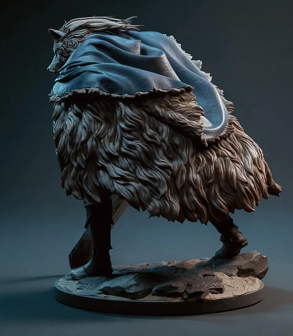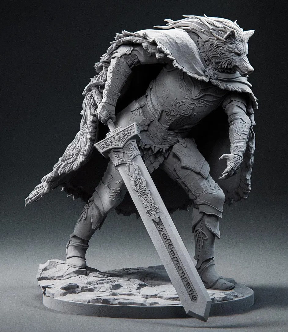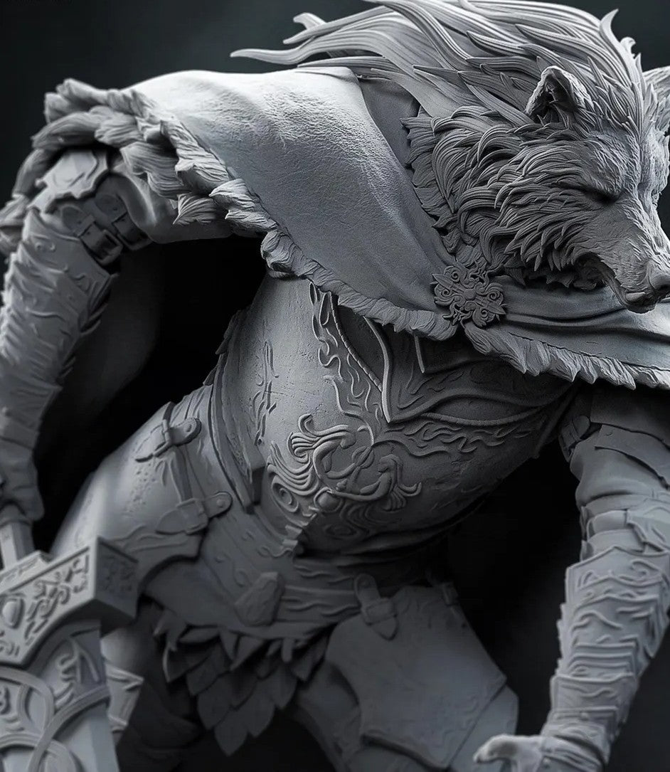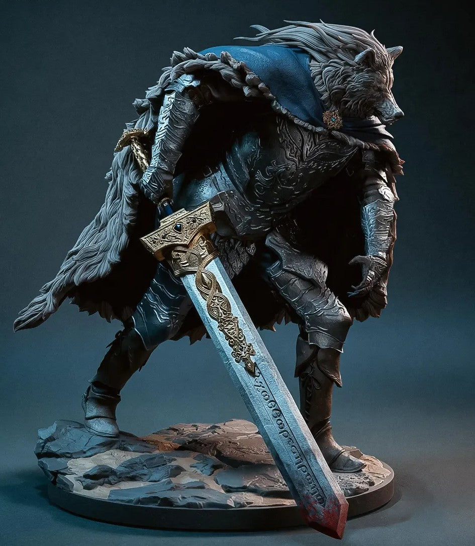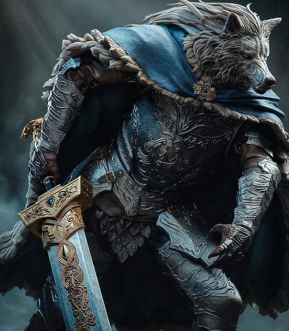 Apresentando Blaidd, o leal guerreiro lobo do aclamado jogo Elden Ring. Esculpida com grande atenção aos detalhes pela Bulkamancer, esta figura destaca-se por sua armadura imponente, a sua capa de couro meticulosamente trabalhada e uma postura que transmite força contida e nobreza.