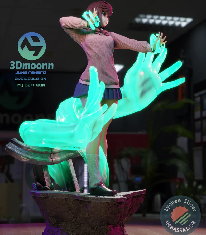 Vestindo o seu icónico suéter rosa e saia azul, e estando lado a lado com seu o gato amuleto da sorte, esta figura de resina pintada à mão transborda de personalidade. A base imita o pavimento de pedra rachada, adicionando uma sensação de movimento e tensão, como se Momo estivesse pronta para enfrentar os espíritos a qualquer momento.
