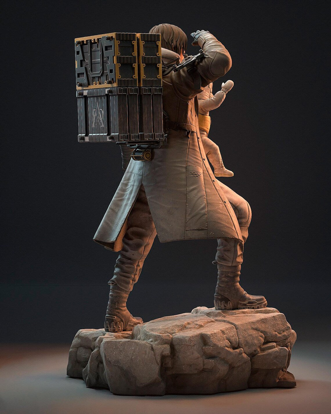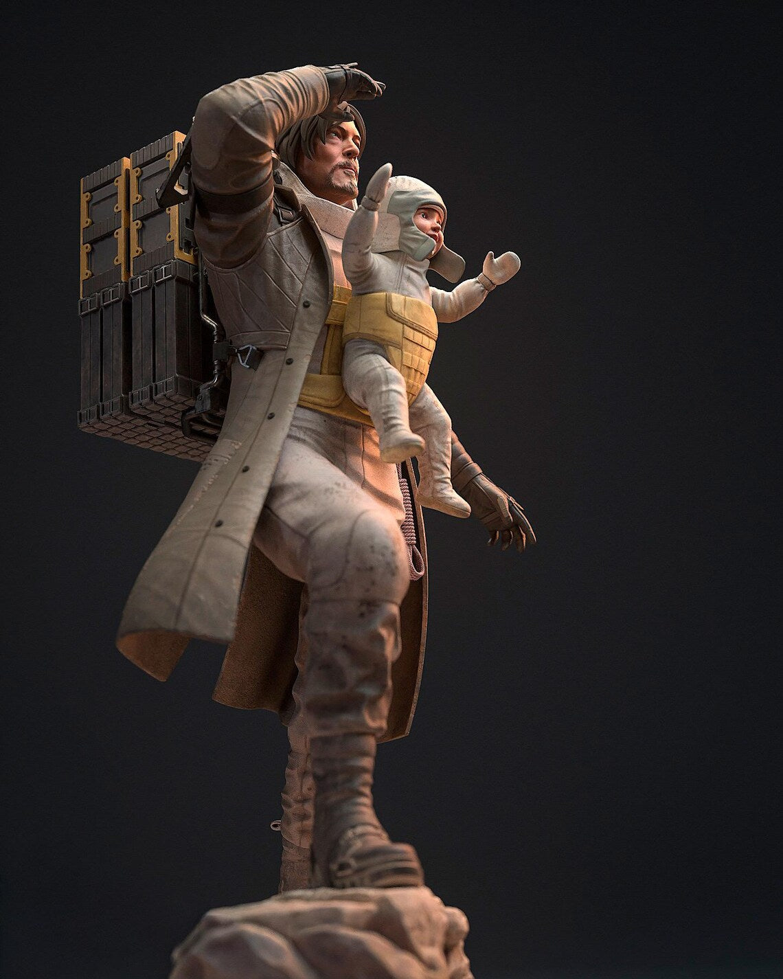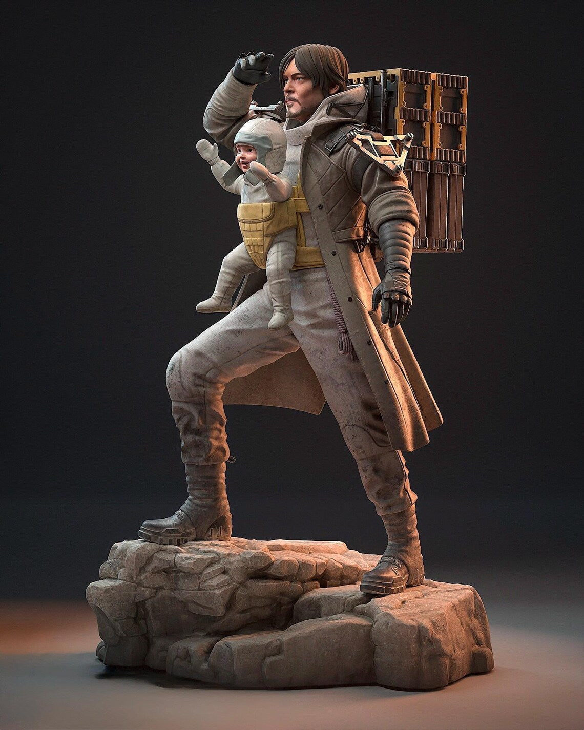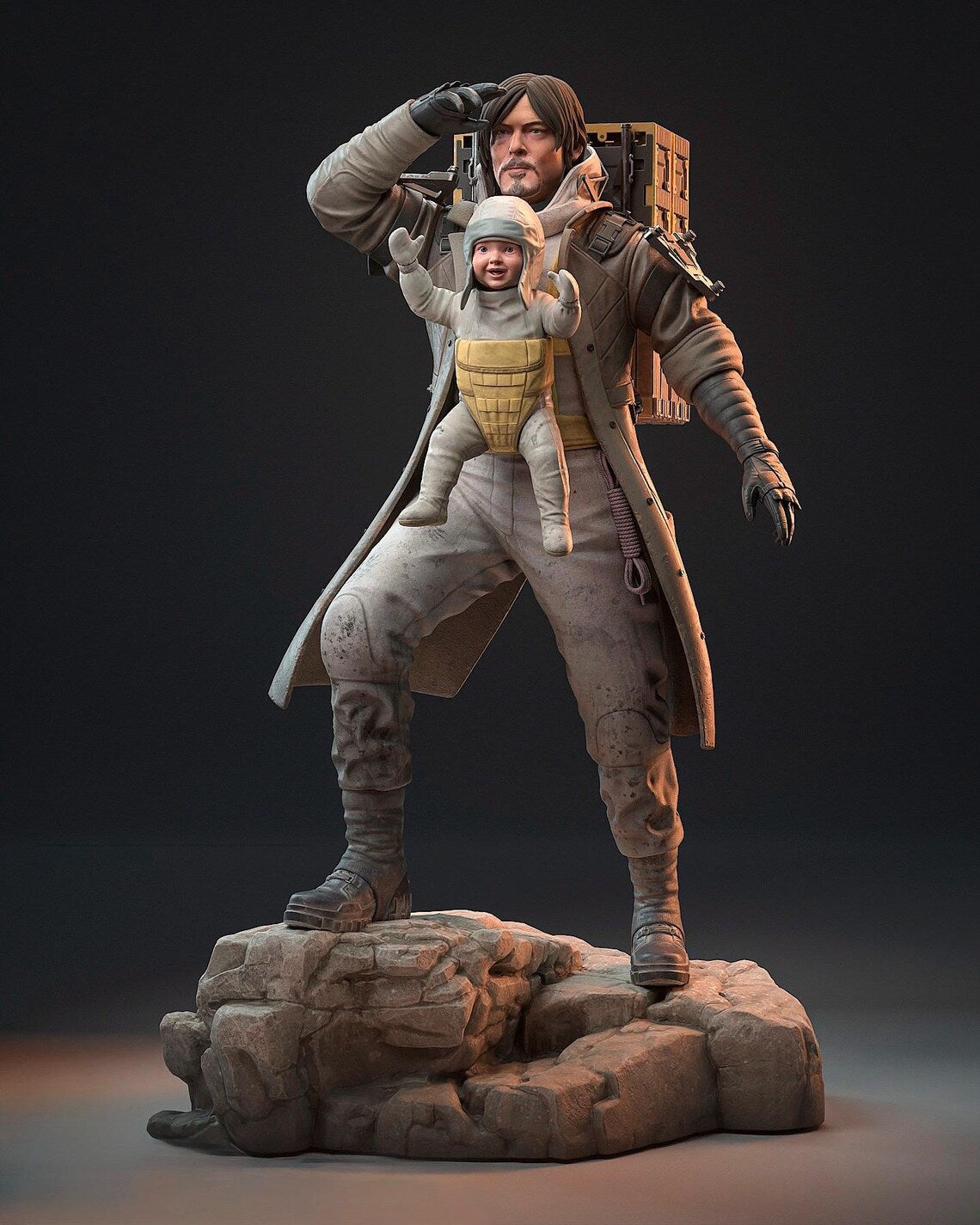 Esta estátua de resina feita à mão captura o vínculo entre Sam e Lou, juntos numa base rochosa, prontos para a próxima entrega.